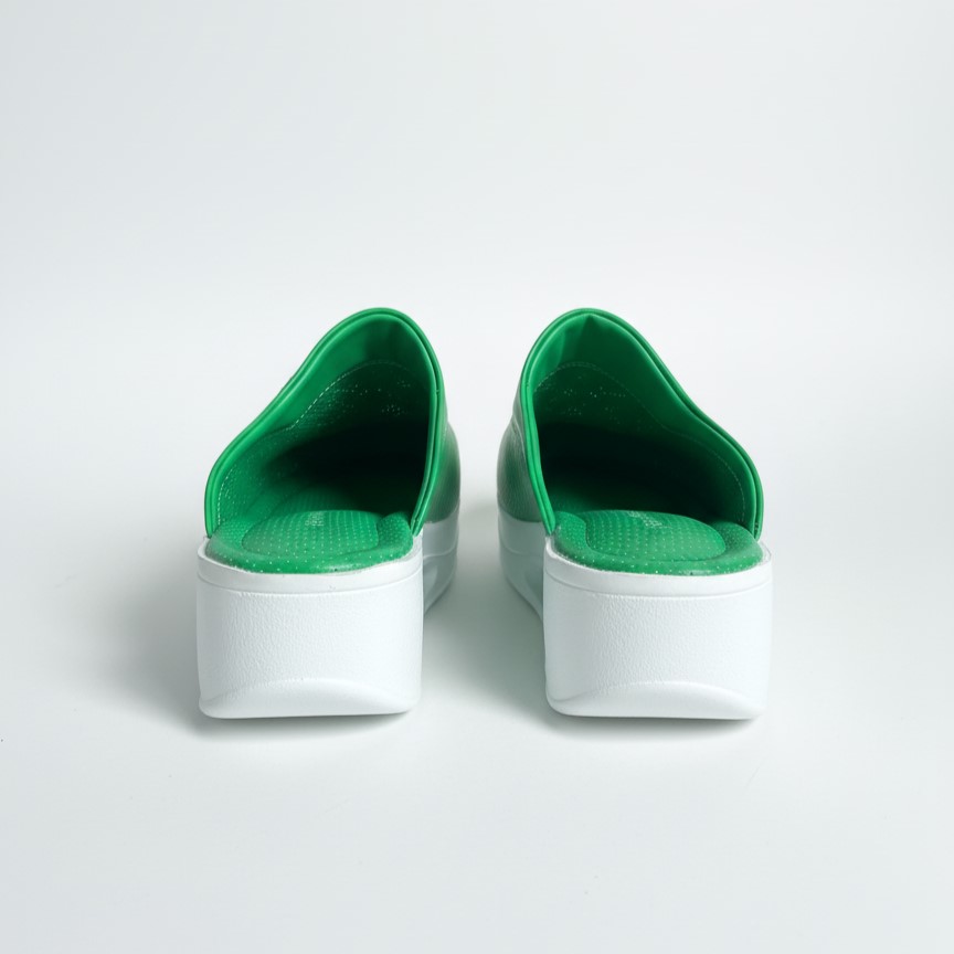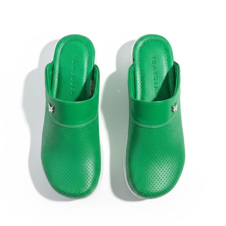 I sabot anatomici Comfort da donna in verde intenso combinano design moderno con alta funzionalità – scelta ideale per professionisti che trascorrono molte ore in piedi. La parte superiore è realizzata in ecopelle di alta qualità con perforazione decorativa.